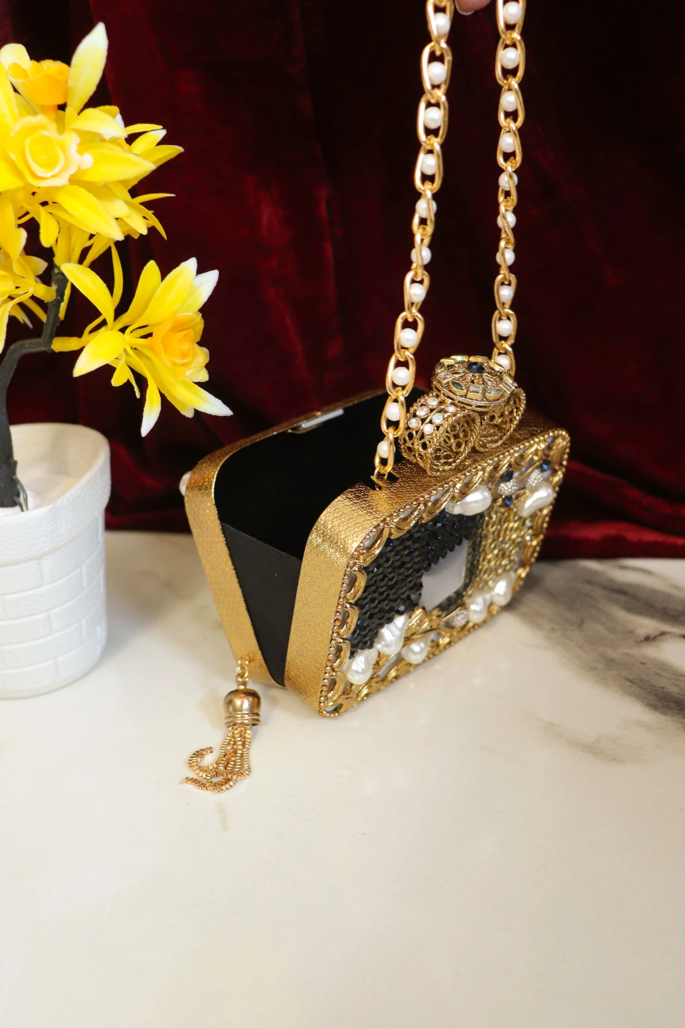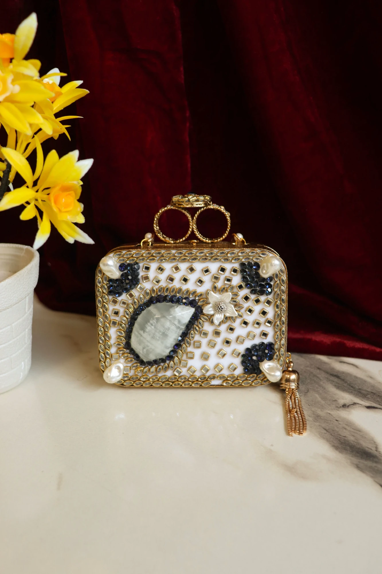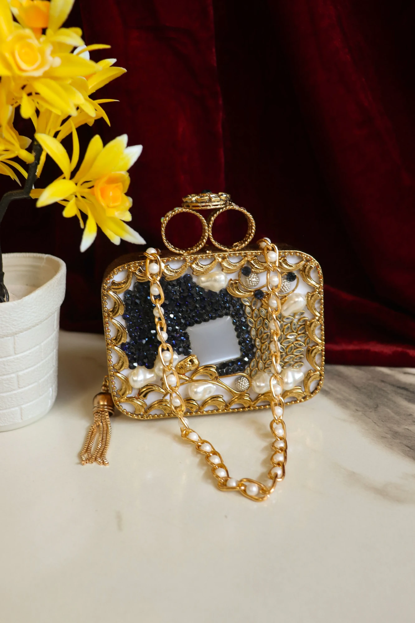 This versatile clutch pairs beautifully with bridal ensembles, sarees, lehengas, anarkalis, and designer fusion outfits. The secure clasp closure ensures convenience, while the sparkling Swarovski crystals create a radiant, eye-catching effect that draws attention and adds a touch of sophistication to your look.
