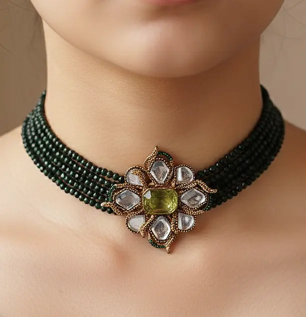 Lightweight yet striking, this choker sits gracefully around the neck, providing comfort along with style. The matching earrings complete the set, creating a balanced and sophisticated look ideal for weddings, parties, and special occasions. The fine detailing and polished finish make it a perfect choice for women who love statement jewellery.