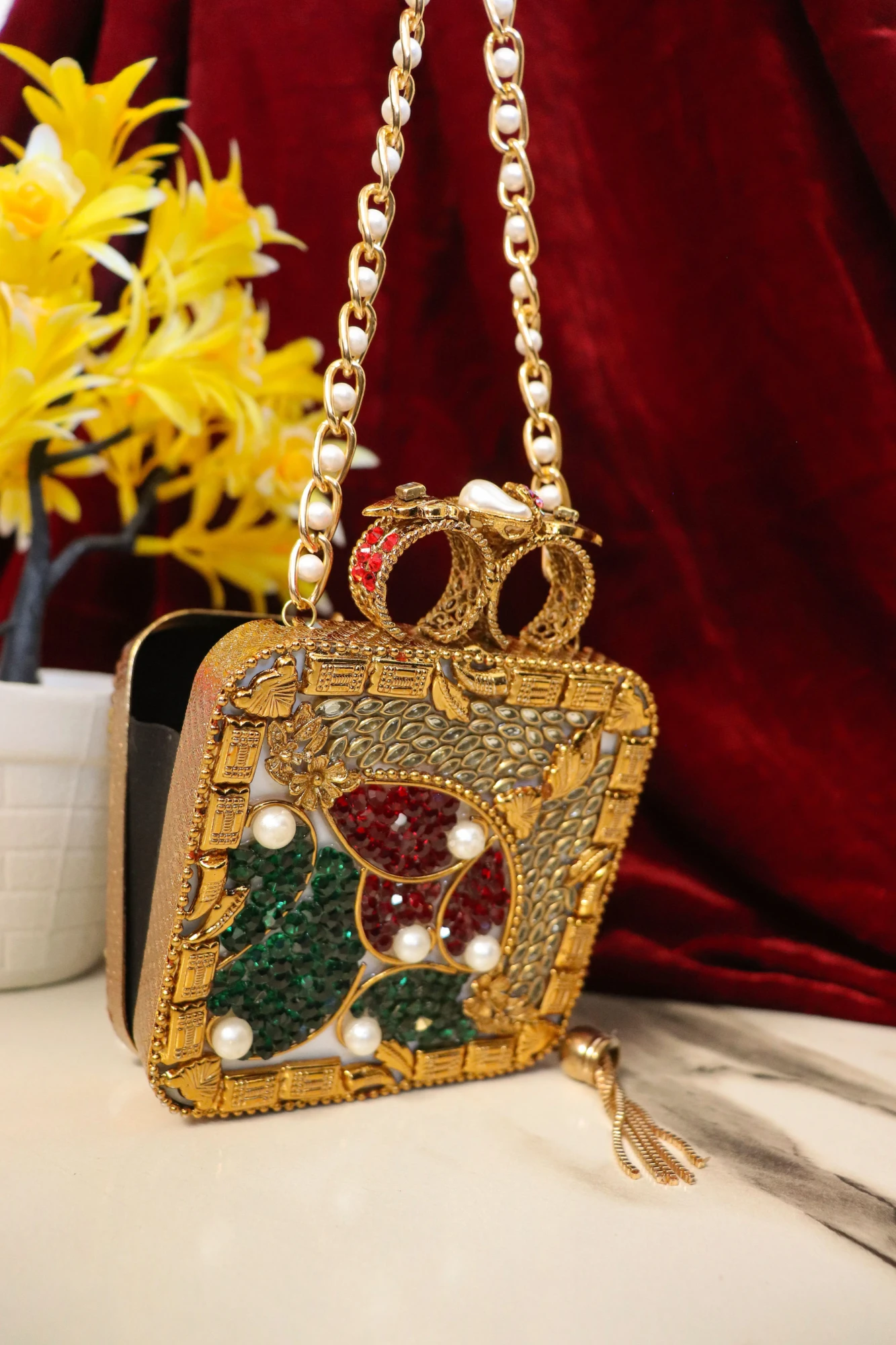 The clutch pairs beautifully with bridal outfits, sarees, lehengas, anarkalis, and designer fusion wear, adding a touch of sophistication and charm. The secure clasp closure allows for worry-free carrying, while the lightweight design ensures comfort even during long celebrations. The combination of elegance, sparkle, and traditional craftsmanship makes it a versatile accessory suitable for a variety of occasions.