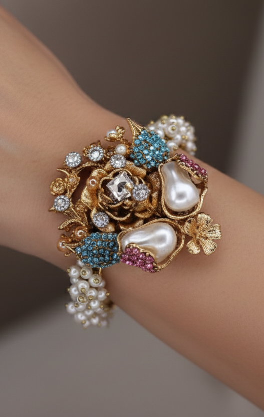 Perfect for weddings, parties, festive occasions, and formal events, the Sea Blue Flower Pearl Kara pairs beautifully with both traditional and modern outfits. Whether styled with sarees, lehengas, or contemporary fusion wear, it enhances your ensemble with elegance and charm. This exquisite kara also makes a thoughtful gift for birthdays, anniversaries, and special celebrations, adding timeless beauty to any jewellery collection.