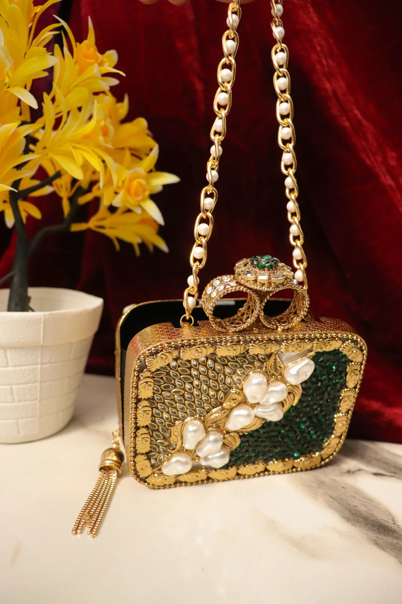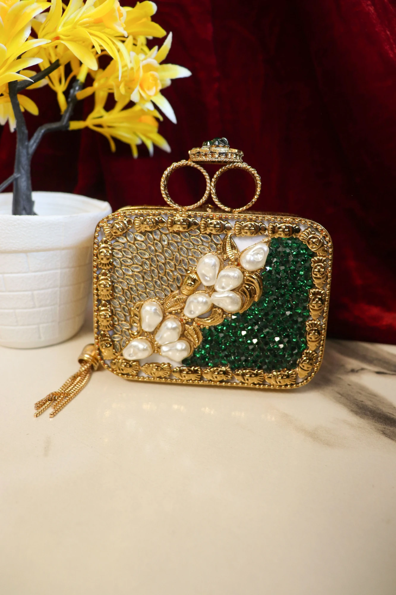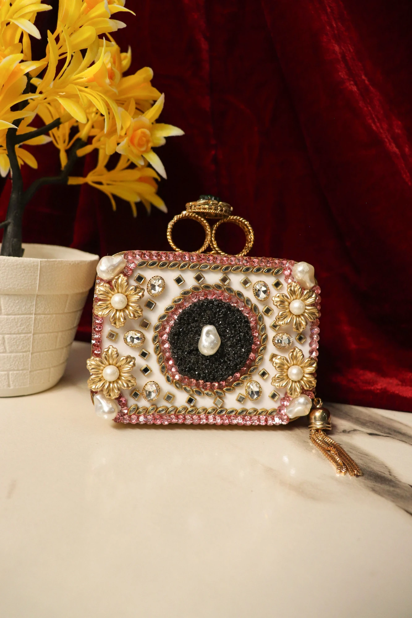 This versatile clutch complements bridal attire, sarees, lehengas, anarkalis, and designer ethnic or fusion outfits. The secure clasp closure ensures safety without compromising elegance, while the shimmering Swarovski crystals add a radiant touch to your ensemble.