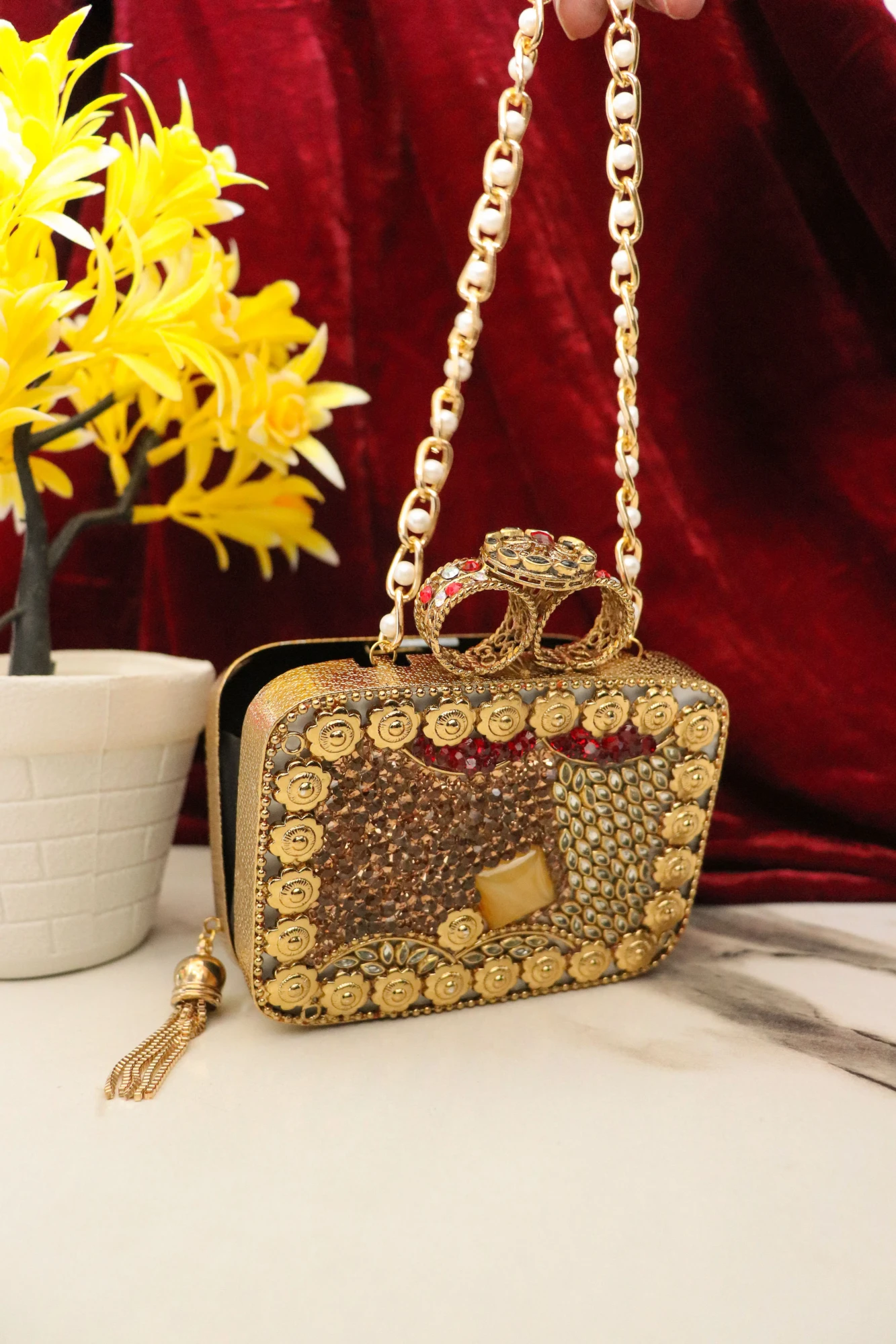 This versatile clutch pairs beautifully with bridal attire, sarees, lehengas, anarkalis, and designer fusion outfits, adding a sophisticated charm to any ensemble. The secure clasp closure ensures convenience and safety, while the shimmering Swarovski crystals create a radiant and eye-catching effect, making it a statement accessory for every special occasion.