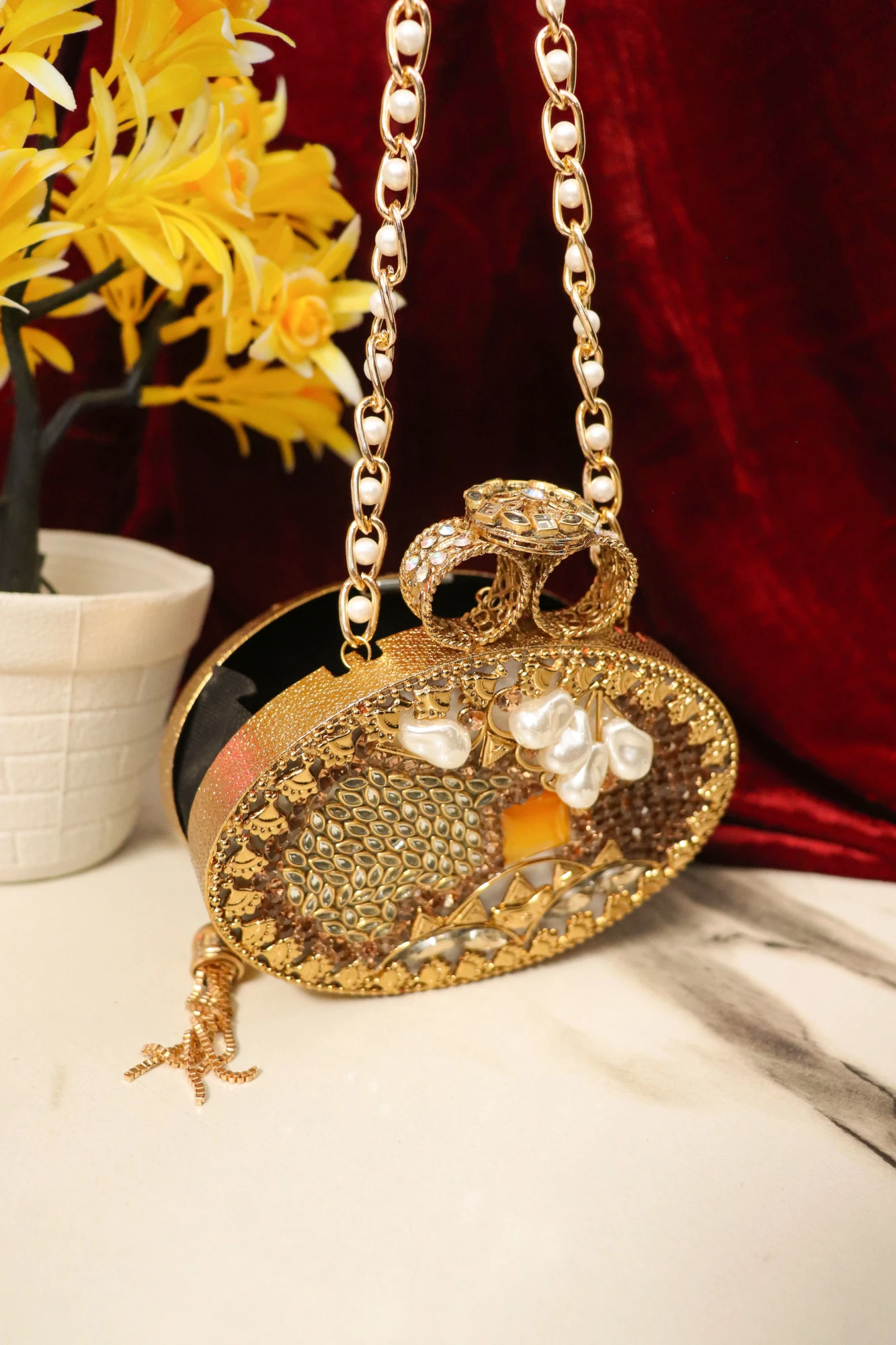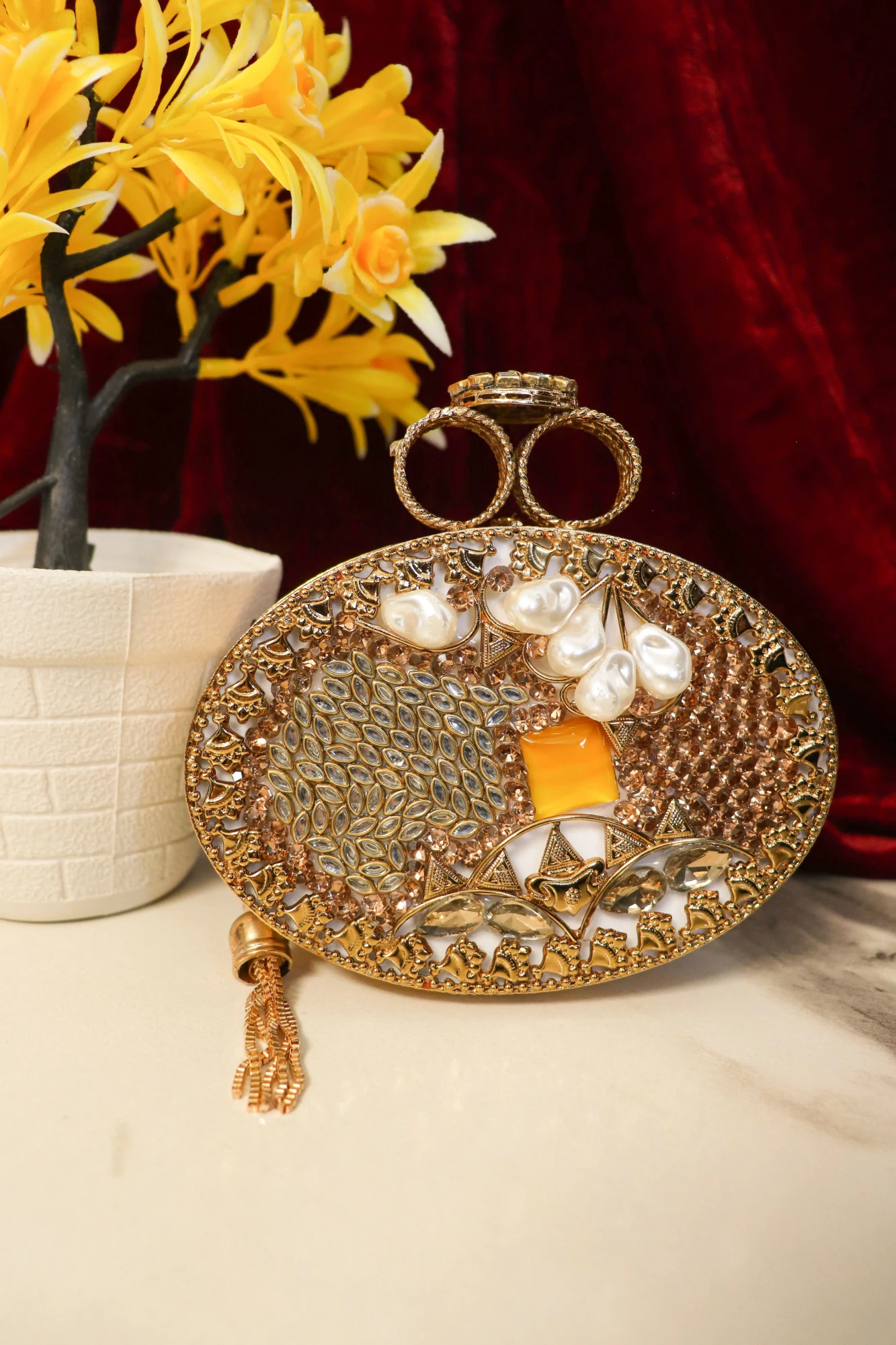 This clutch pairs effortlessly with bridal wear, sarees, lehengas, and designer ethnic or fusion outfits. The secure clasp closure ensures safety and ease of use, allowing you to carry it comfortably throughout long celebrations. Its elegant design not only completes your outfit but also elevates your overall look with a touch of royalty.