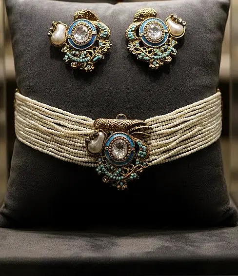 The calming sea blue tones combined with exquisite Meenakari detailing make this necklace set a versatile and eye-catching addition to your jewellery collection, perfect for adding elegance and vibrancy to your look.