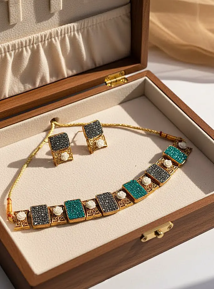 Whether paired with sarees, lehengas, or modern dresses, the Turkish Choker Set with Sea Green Pearls adds a pop of color and timeless charm to your jewellery collection, making it a versatile and essential statement piece.