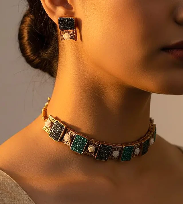 Add a refreshing touch to your look with this Turkish Choker Set with Sea Green Pearls. Featuring lustrous sea green pearls and intricate Turkish-inspired designs, this choker set exudes elegance and sophistication. Perfect for weddings, parties, and festive occasions, it enhances both traditional and contemporary outfits with its vibrant yet classy appeal.