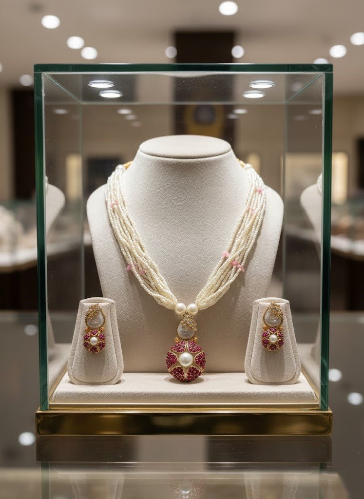 Perfect for weddings, festive occasions, parties, and formal celebrations, this lightweight mala sits comfortably on the neckline, complemented by matching earrings to complete your ensemble. It pairs effortlessly with sarees, lehengas, gowns, and fusion outfits, adding a regal and refined touch to your look.